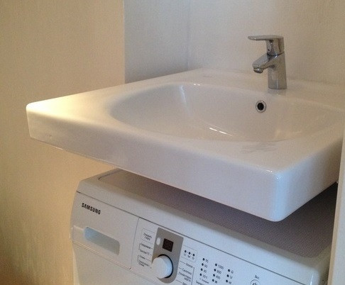 Практичное решение для небольших ванных комнат, где нужно совместить функционал и экономию пространства. Такая раковина устанавливается прямо над стиральной машиной и позволяет эффективно использовать зону, которая обычно остаётся пустой. Подходят только специальные модели — с плоским сифоном и смещённым сливом, чтобы коммуникации не мешали технике.