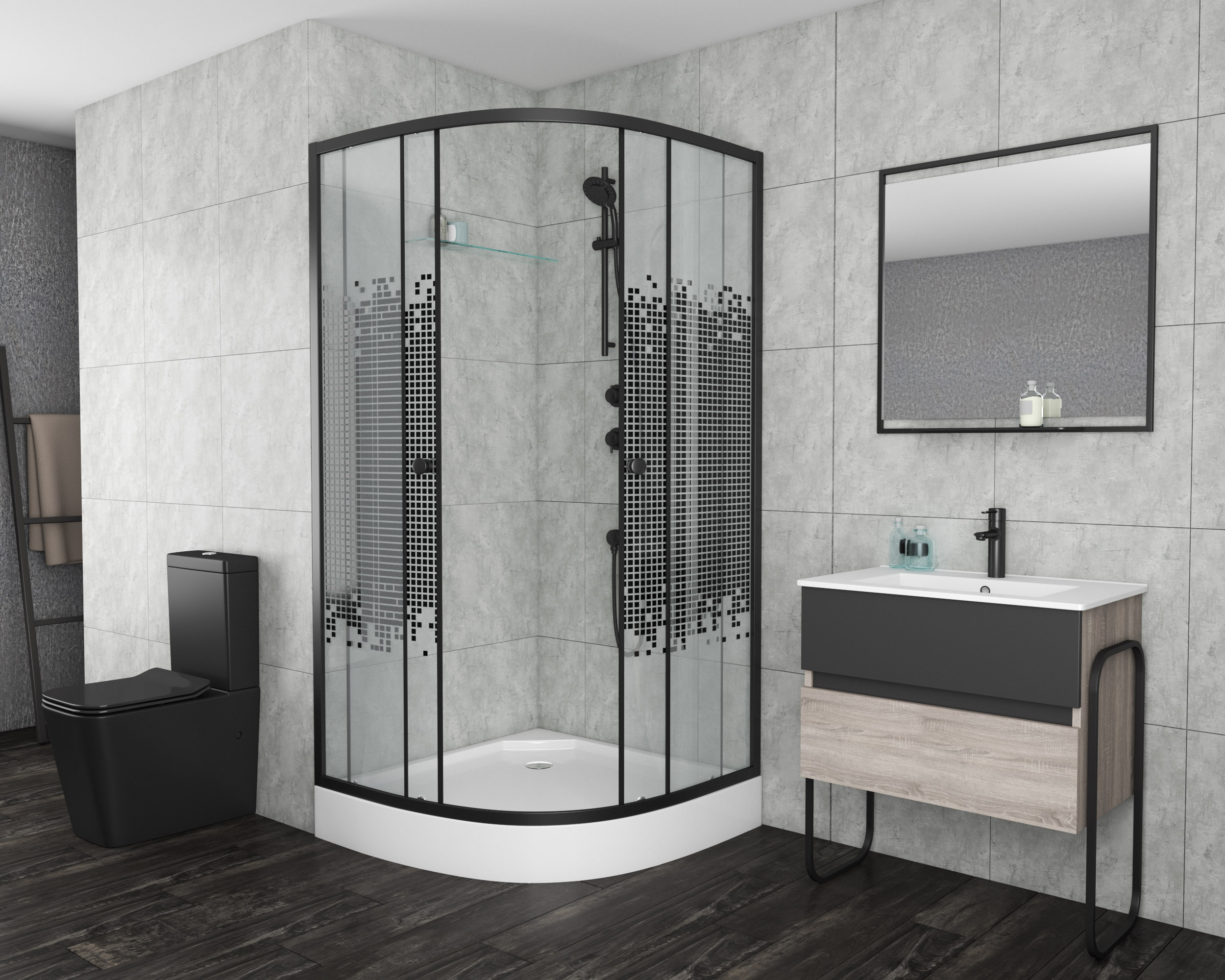 душевой уголок 900х900х1950 низкий поддон(13см) стекло МОЗАИКА 2 места NG-007-14BLACK