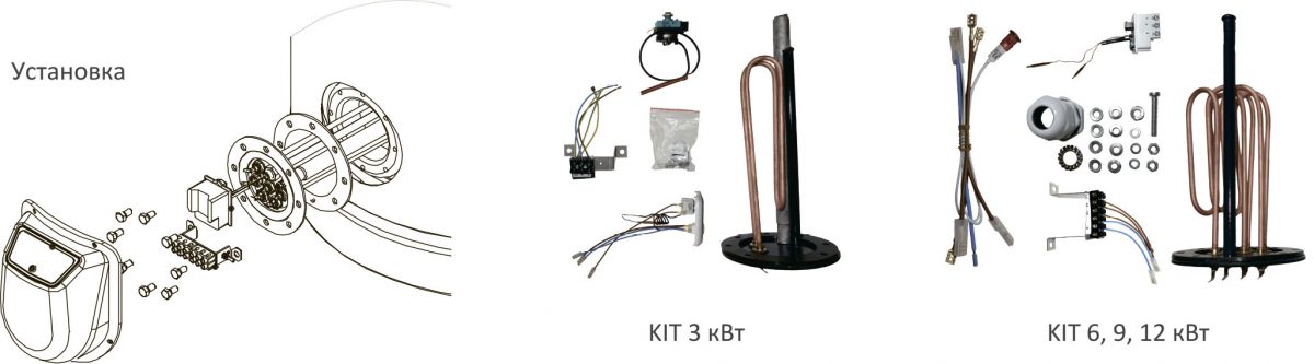 - Комплект KIT 6, 9, 12 кВт подходят для напольных емкостей серий V, VS, VS2 от 300 до 2000 л.