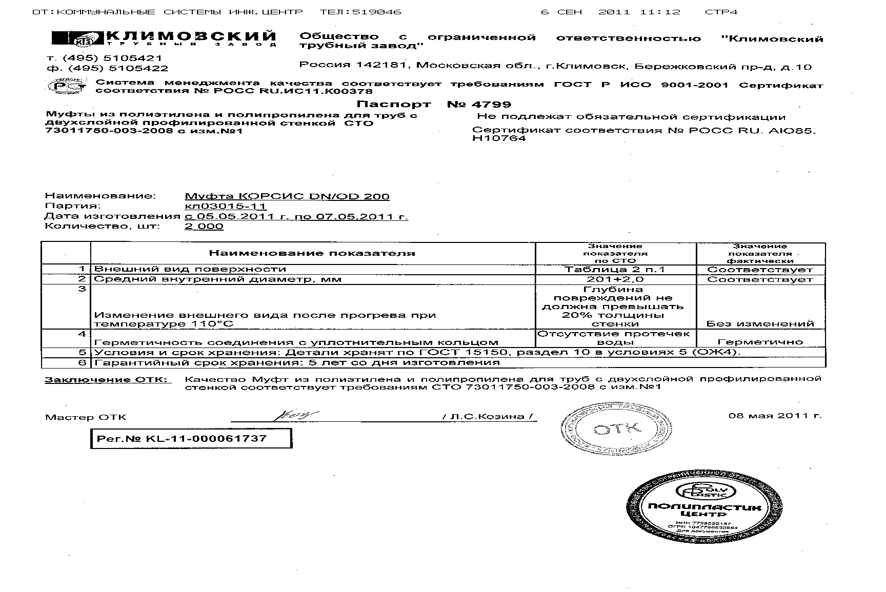 муфта для прохода через ЖБИ ОD по наружнему диаметру 315 Корсис