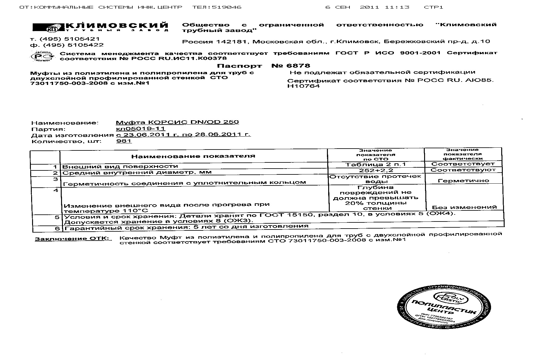 муфта для прохода через ЖБИ ID по внутреннему диаметру 250 Корсис