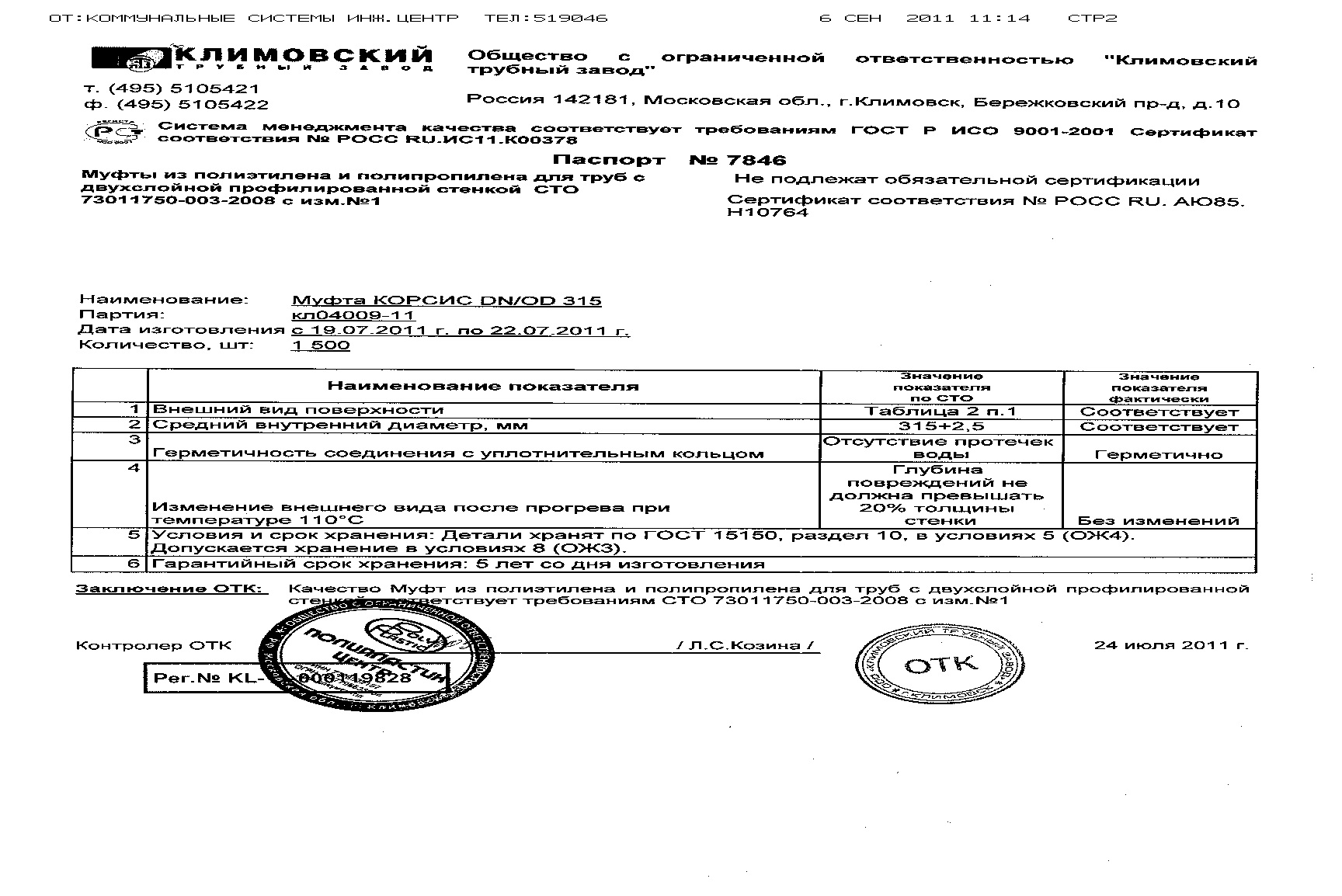муфта для прохода через ЖБИ ОD по наружнему диаметру 630 Корсис