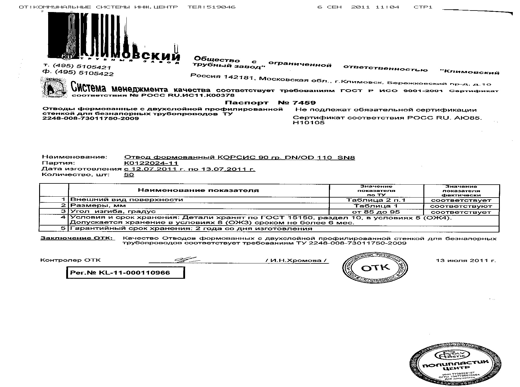 отвод 90* 110мм формованный Корсис