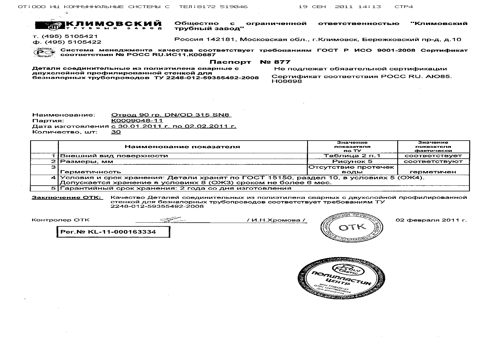 отвод 90* ID по внутреннему диаметру 300мм Корсис