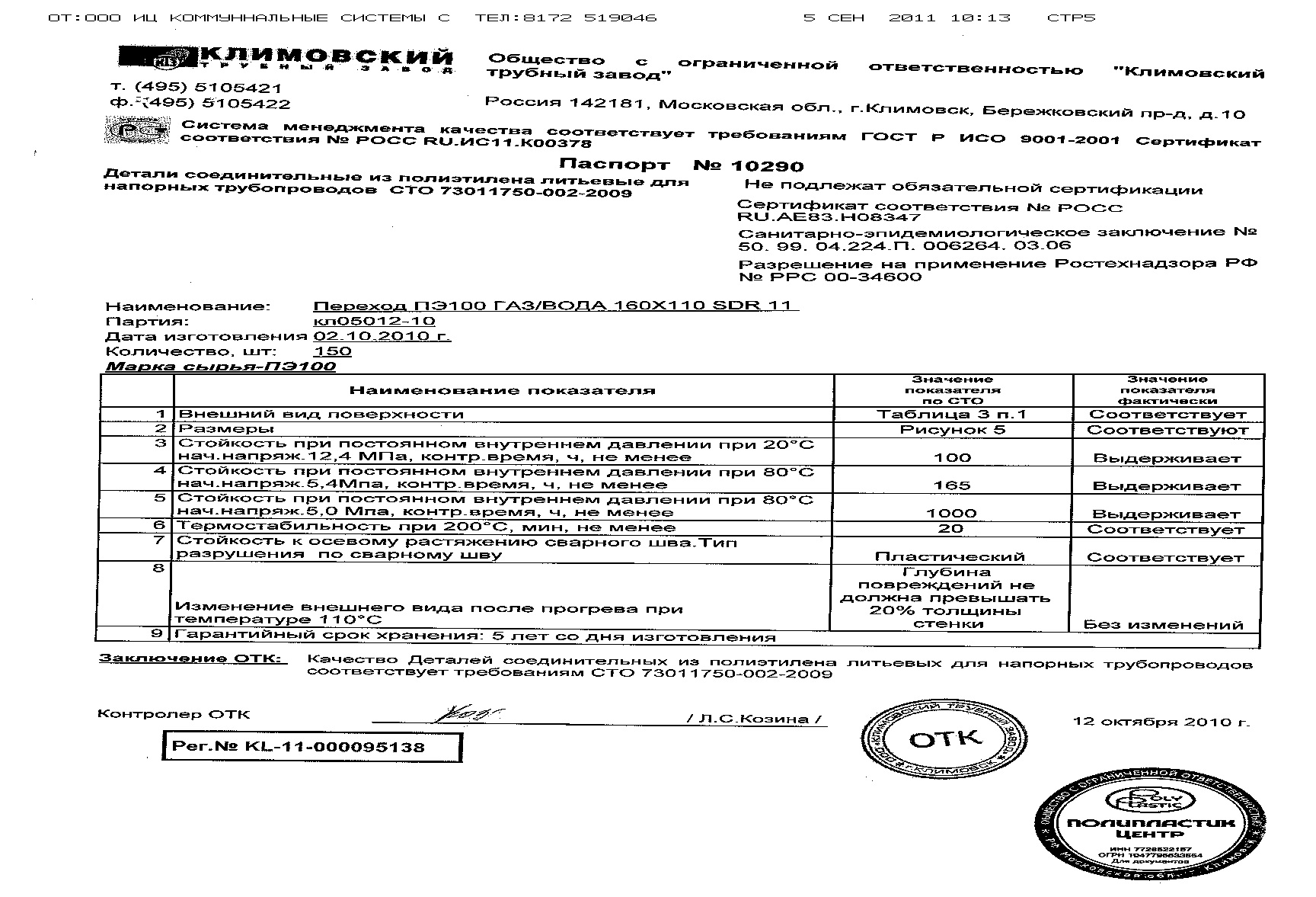 переход редукционный 110х090 мм ПЭ100 SDR11 удл. ЮУП