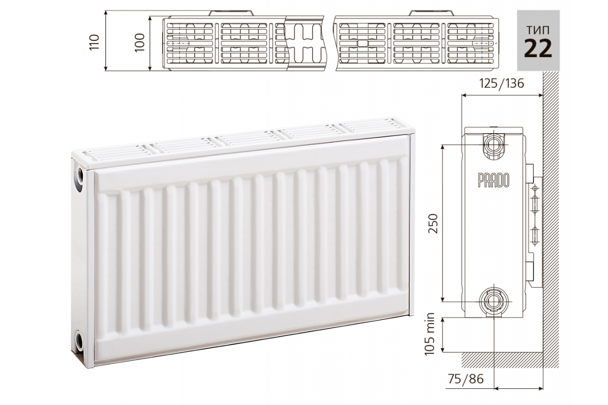 PRADO Universal 22x500x1800 - современный радиатор отопления из стали. Соответствуют всем гигиеническим и пожарным нормам РФ.