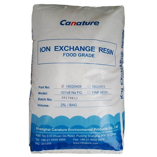 Сильнокислотная катионообменная смола Canature Na FG гелевого типа используется для удаления из воды солей жесткости, ионов железа и марганца.