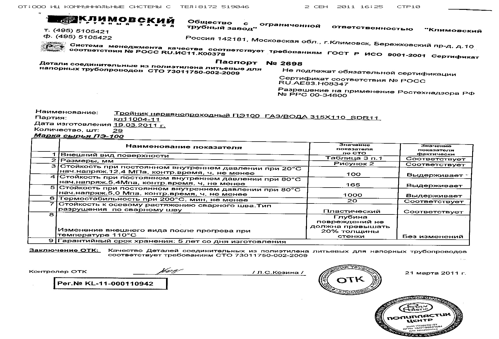 тройник редукц. 315х110мм ПЭ100 SDR11