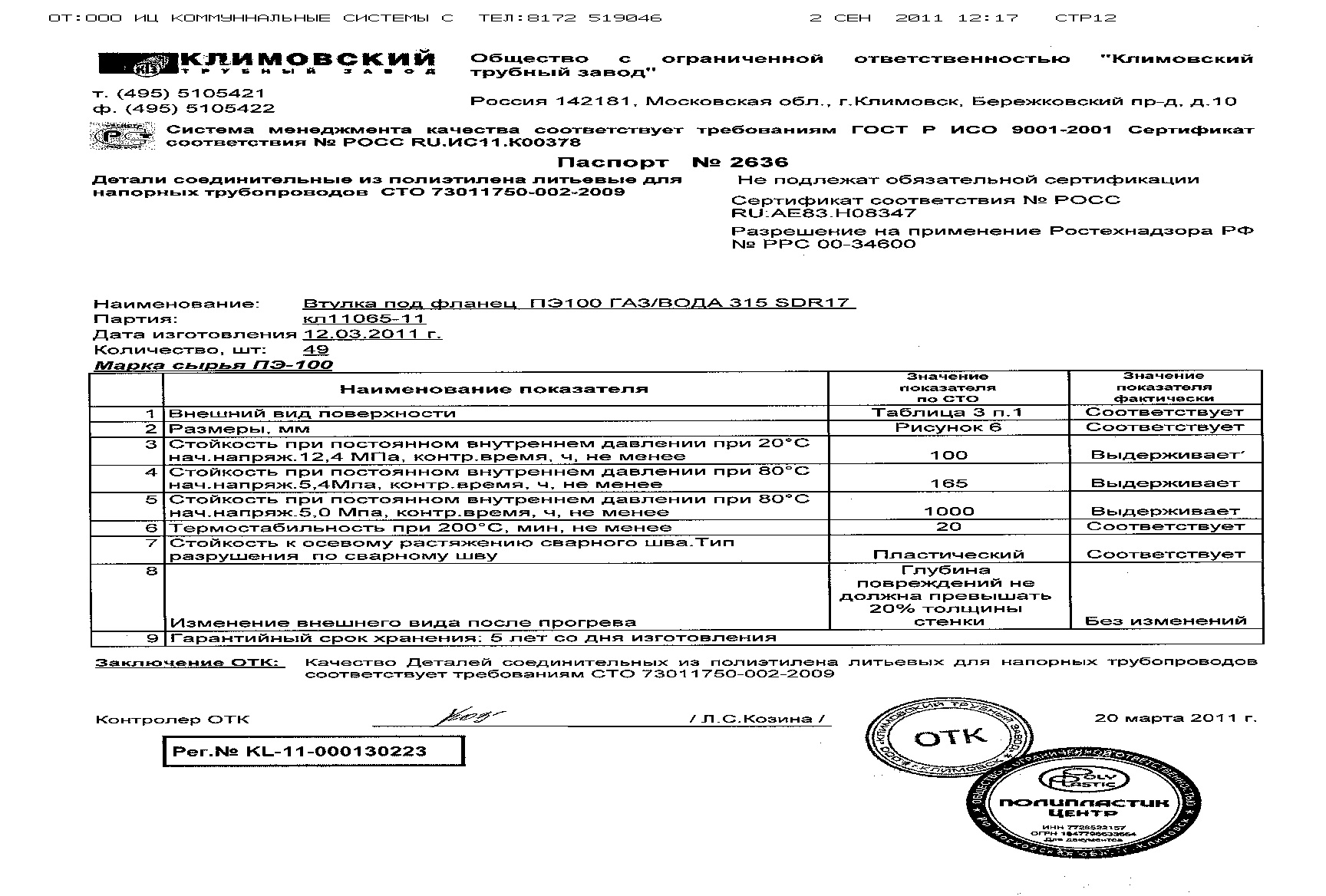 втулка под фланец 315мм ПЭ100 SDR11 удл.