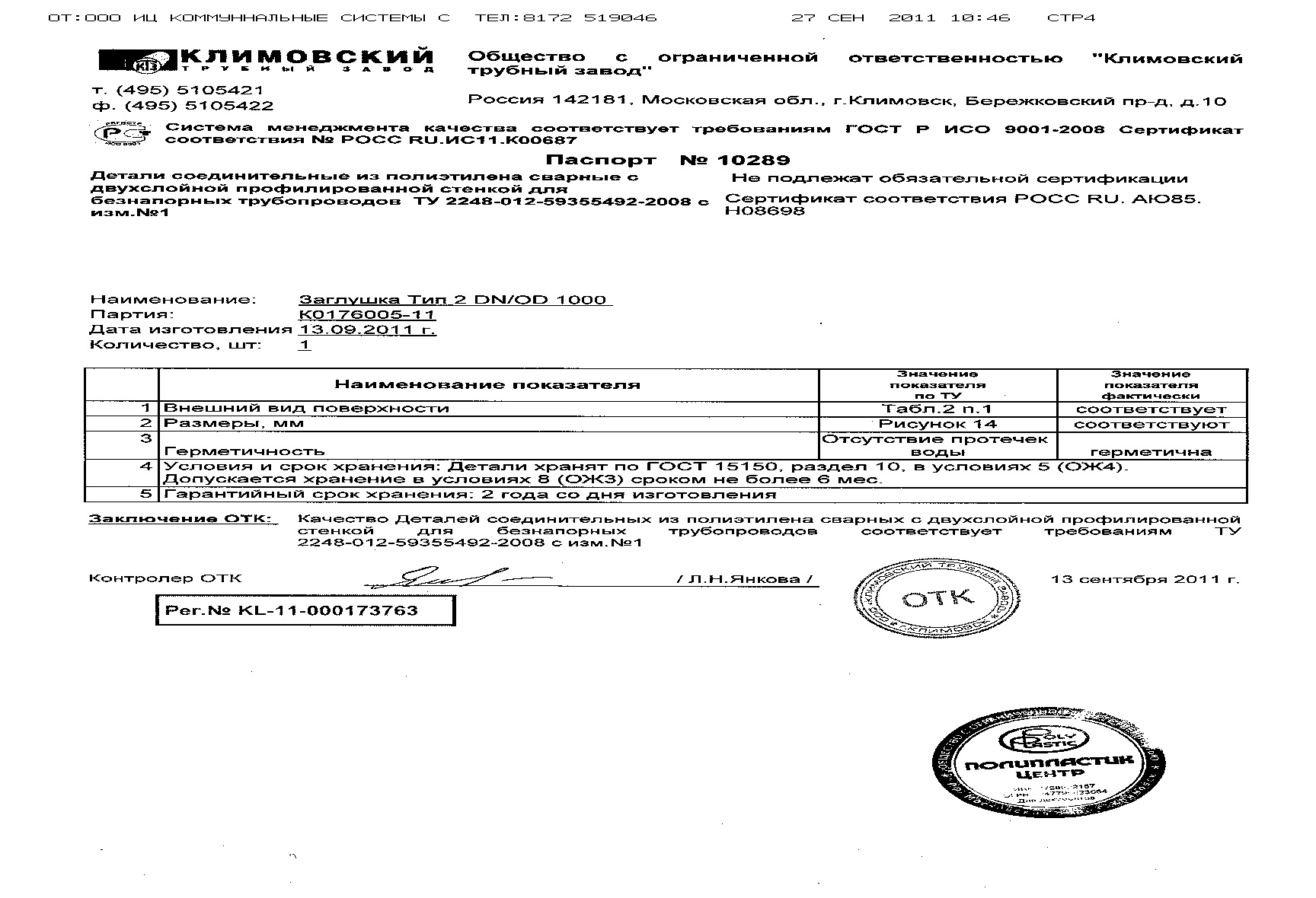 заглушка ID по внутреннему диаметру 800мм Корсис св.