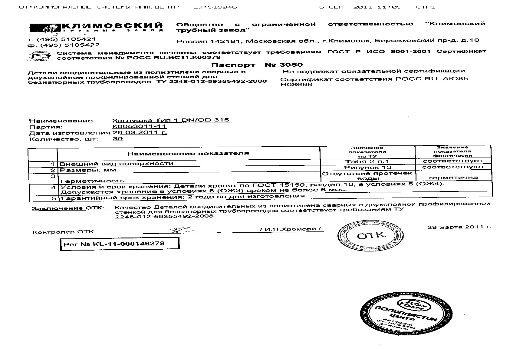заглушка ID по внутреннему диаметру 600мм Корсис св.