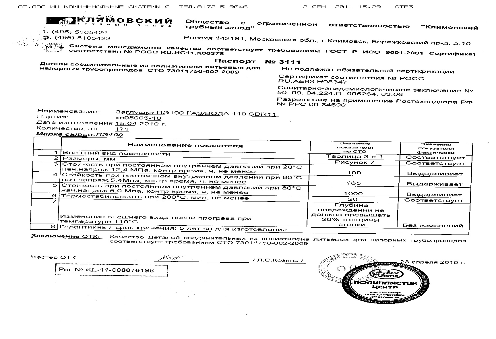 заглушка удлиненная 110мм ПЭ100 SDR11